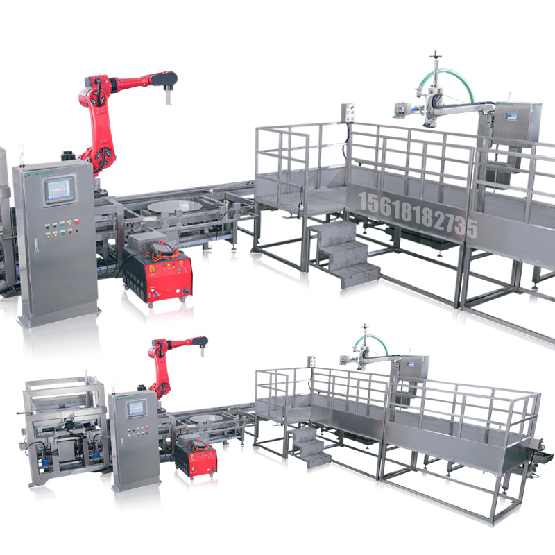 ■ 采用自動(dòng)供棧,IBC噸箱機(jī)械手自動(dòng)豎桶,人工輔助套袋,定位灌裝;