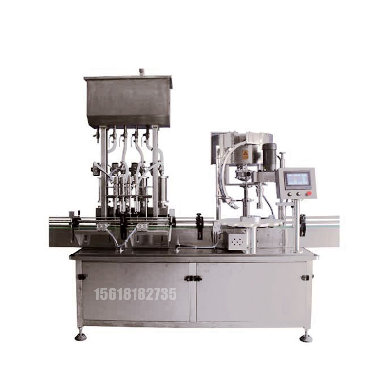??該機灌裝部分采用伺服電機驅動、容積式計量充填原理,實現了灌裝劑量的高精度。旋蓋部分由供蓋系統、刮蓋、壓蓋、夾緊、輸瓶和旋蓋等