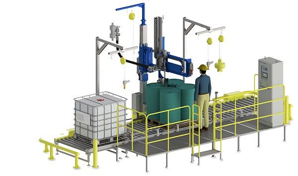 The automatic drum filling system is suitable for filling liquid and viscous products into metal and plastic drums from 120 to 250 liters. It is fully automated, very safe for operators, and has an integrated automatic conveyor line. Different workstations can be added to the equipment.